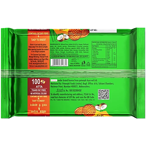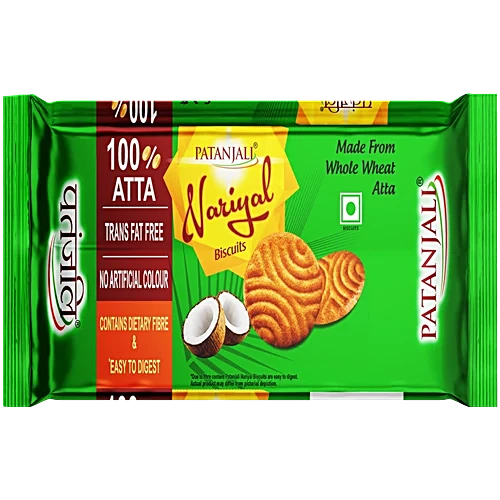 Indulge in the tropical delight of Patanjali Nariyal Atta Biscuit, made with the goodness of coconut flour. These biscuits offer a delightful crunch and a hint of coconut flavour, providing a sweet treat with a subtle coconut essence. Enjoy the wholesome benefits of natural ingredients in every bite, making them a perfect companion for your tea-time or anytime snacking. With a crisp texture and a satisfying coconut flavour, these biscuits are ideal for those who enjoy a light, crunchy and flavourful snack.